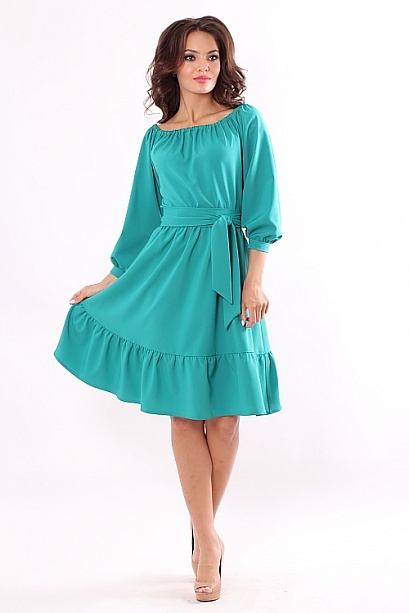Платье из текстильного полотна с открытыми плечами отрезное по талии по юбке притачной волан пояс в комплекте