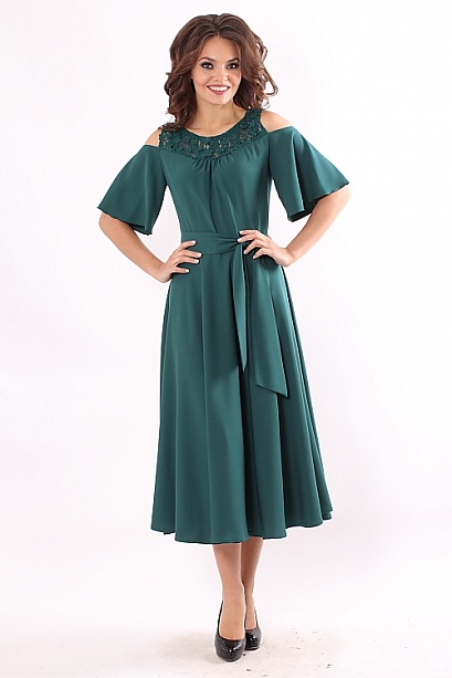 Нарядное платье длины миди по лифу кружевная кокетка отрезное по линии талии юбка солнце пояс в комплекте по спинке застежка молния
