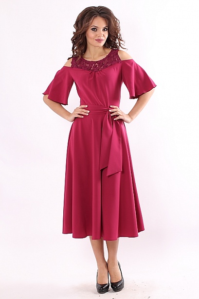 Нарядное платье длины миди по лифу кружевная кокетка отрезное по линии талии юбка солнце пояс в комплекте по спинке застежка молния