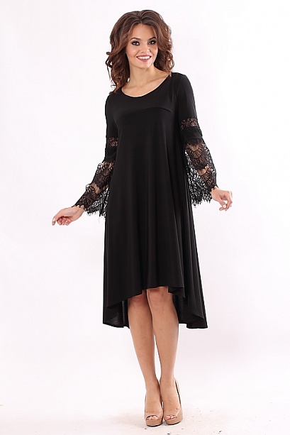 Нарядное платье трапецивидного силуэта с разноуровневым подолом из тонкого трикотажа рукава из кружева